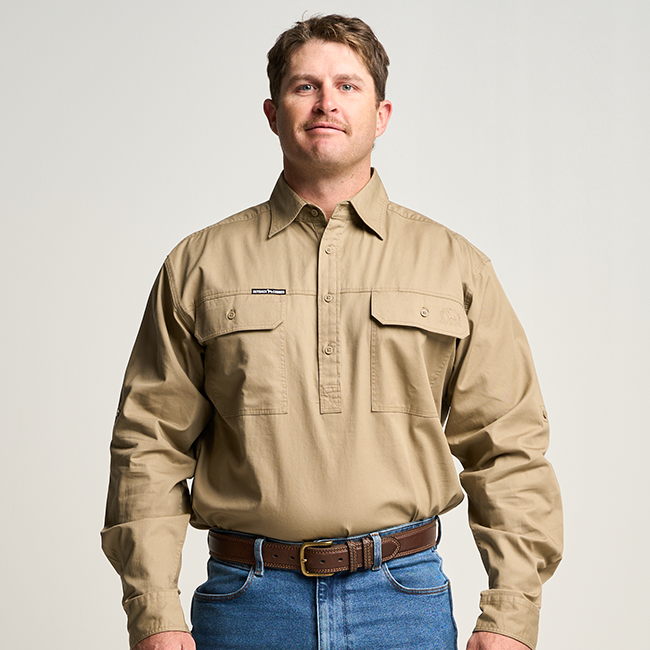 KILCOY | Mens Half Button Long Sleeve Work Shirt | Khaki